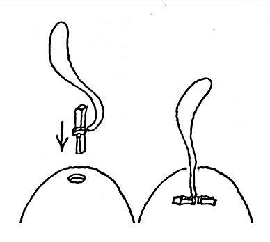 К СВЕДЕНИЮ: чтобы на ёлочной игрушке сделать петельку для ёлки, сломайте спичку пополам и к её середине привяжите нитку так, чтобы получилась петелька. Теперь эту половинку спички целиком засовываем в яйцо через верхнюю дырочку: там спичка развернётся и застрянет, удерживая петельку (рис.7).
