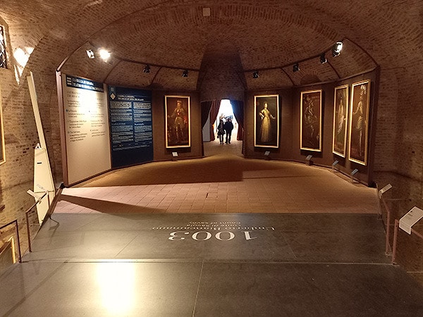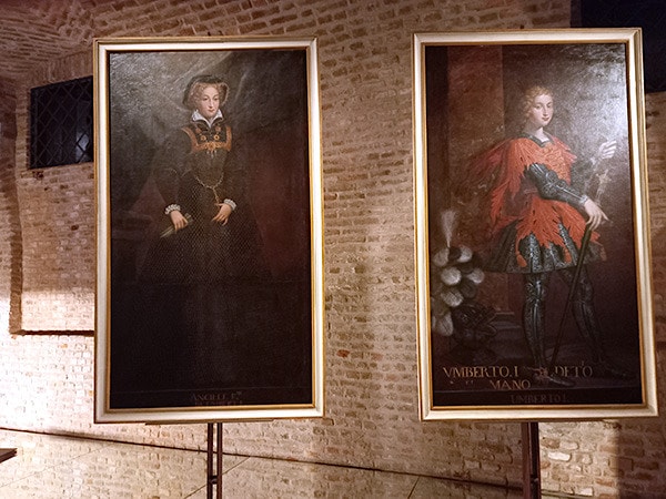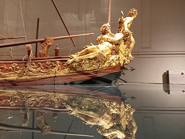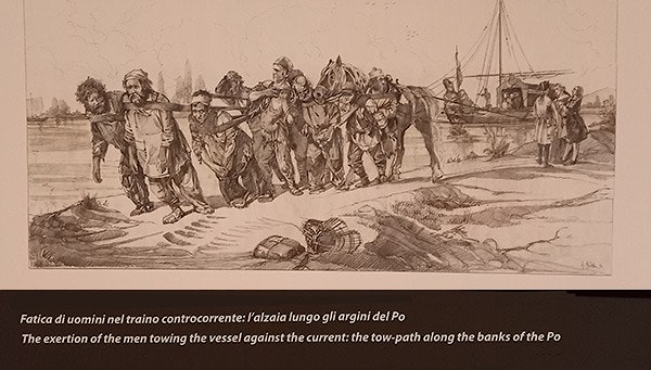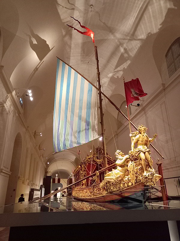 На этой галере монархи с шиком путешествовали в Рим вниз по течению реки По. Назад же эту галеру тащили бурлаки (точь-в точь, как на памятной картине Перова), что объясняется для современных зрителей на рисунках, которые экспонирующимся тут же.