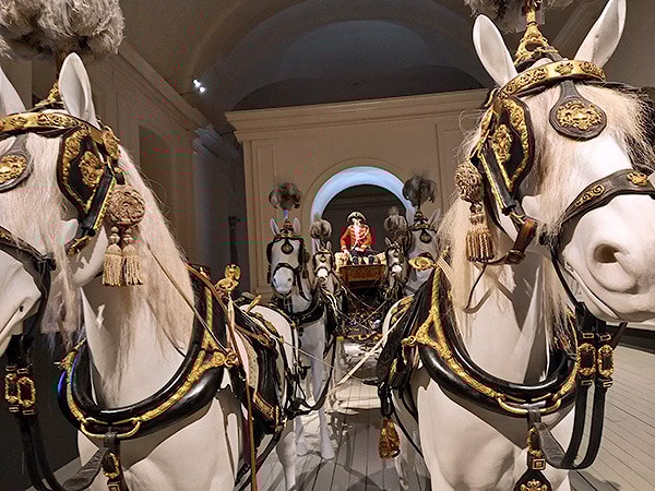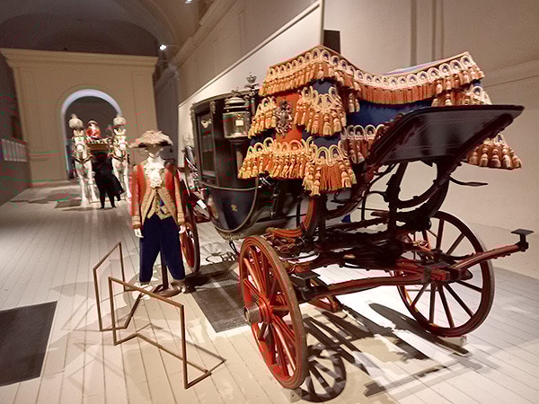 Кроме огромной галеры, невдалеке выставлены конные экипажи, а также многочисленные избыточные украшения, надетые на стоящие здесь же манекены лошадей. Кареты, фактически дома на колесах, дают понимание того, насколько в прошлом этот вид передвижения был громоздким.