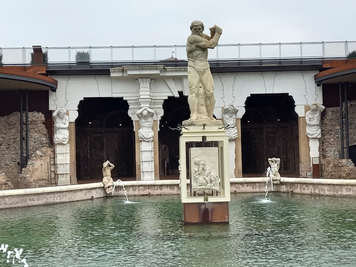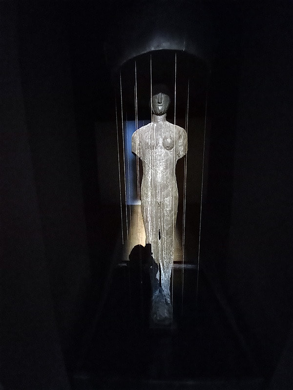 В третьей подобие древней скульптуры помещено в металлическую клетку.